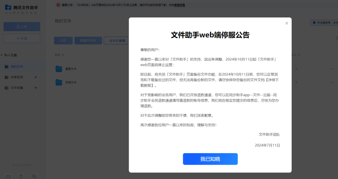 日前,“腾讯文件助手”发布公告称,其小程序以及Web端将于2024年10月11日起停止运营,用户需尽快保存已备份的文档。