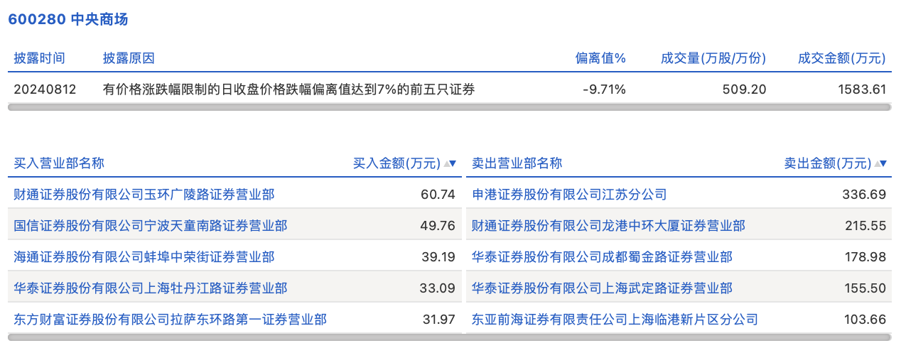 8月12日,中央商场今日跌停,龙虎榜数据显示,上榜营业部席位全天成交1205.13万元,占当日总成交金额比例为76.1%。其中,买入金额为214.75万元,卖出金额为990.38万元,合计净卖出775.63万元。