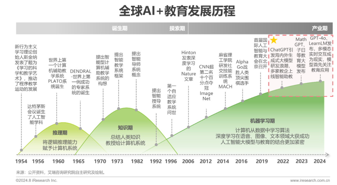 纵观全球AI+教育产业的发展历程,不难发现其发展受AI技术变革影响明显。在AI+教育走过漫长的萌芽及摸索期时,深度学习技术的突破发展推动AI开启商业化之路,AI+教育也随之进入产业期。近两年间,随大数据、云计算等技术的提升,大规模语言模型急速发展,ChatGPT、Stable Diffusion、Gemini等通用大模型争相发布,MathGPT、子曰等教育垂类模型也相继问世。在大模型加持下的AI+教育产业再次迸发生机,帮助师生大幅提升教学效率,推动大规模的因材施教逐步落地。