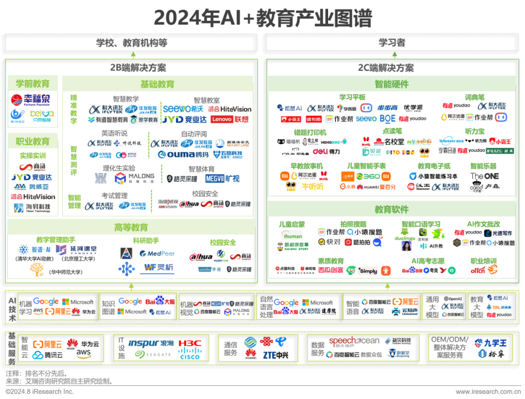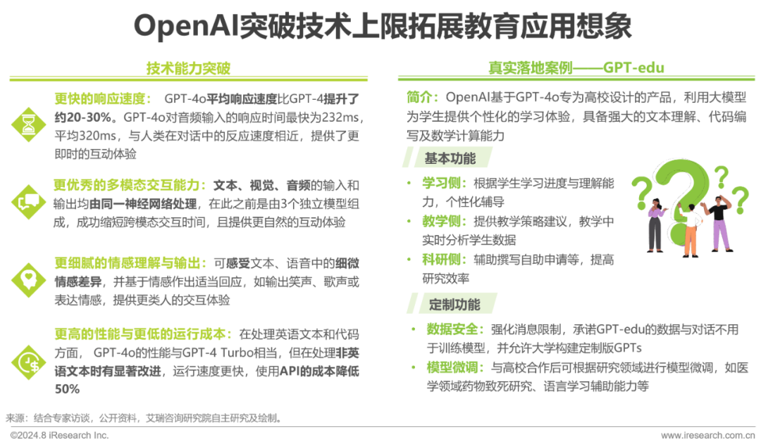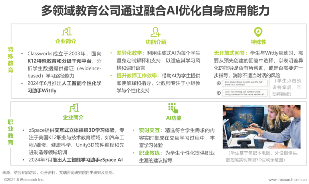 在全球政府、社会、资本的高度关注下,AI技术不断突破已有上限,并拓展教育应用想象空间,如Open AI,其于2024年5月推出GPT-4o,实现了响应速度、多模态交互等多维度的技术提升,并于同年6月推出专为高校场景设计的GPT-edu,灵活应用于科研等细分场景。同时,特殊教育、职业教育也积极引入AI功能,拓展AI惠及人群类型,如Classworks通过无开放式问答的方式推出特殊教育人工智能助手Wittly;zSpace也已通过引入人工智能学习助手,为实训学习加入实时交互功能与职业生涯指导等功能。