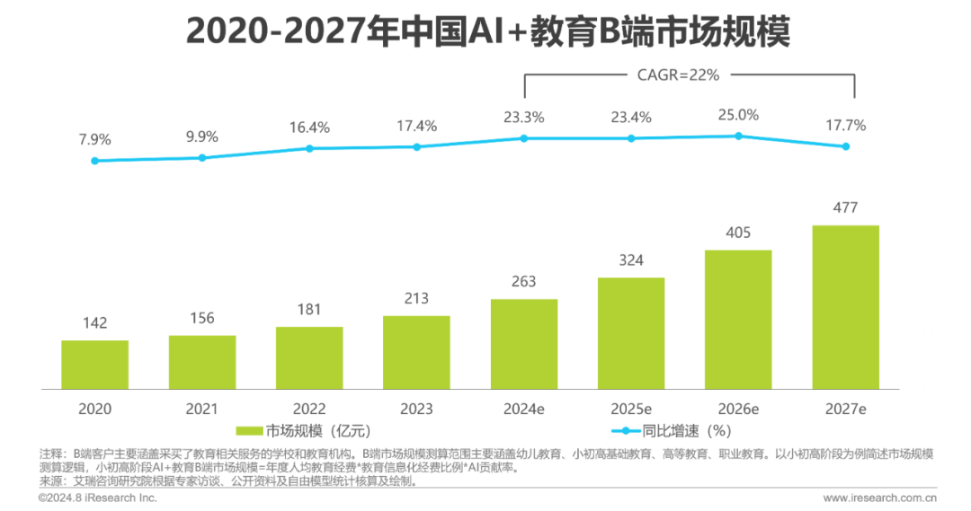 2023年AI+教育B端市场规模约为213亿,预计2027年将达到约476亿元