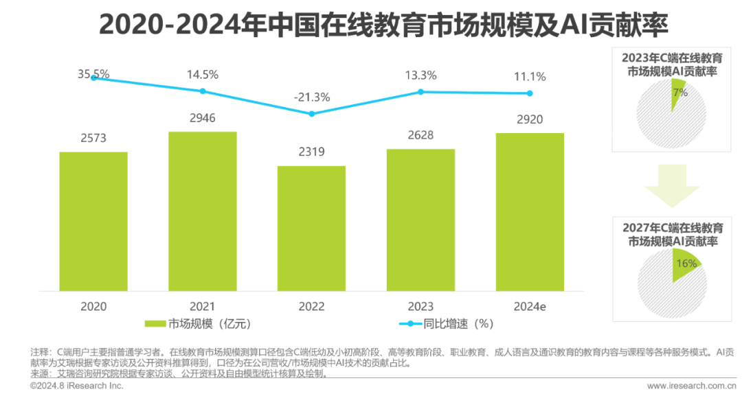 2023年在线教育市场规模2628亿,AI贡献率7%,市场空间广阔