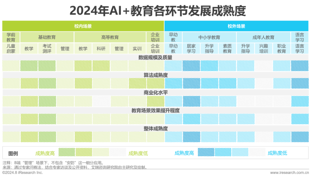 AI+教育已在校内外多点应用,其中中小学教育应用已步入高成熟度阶段