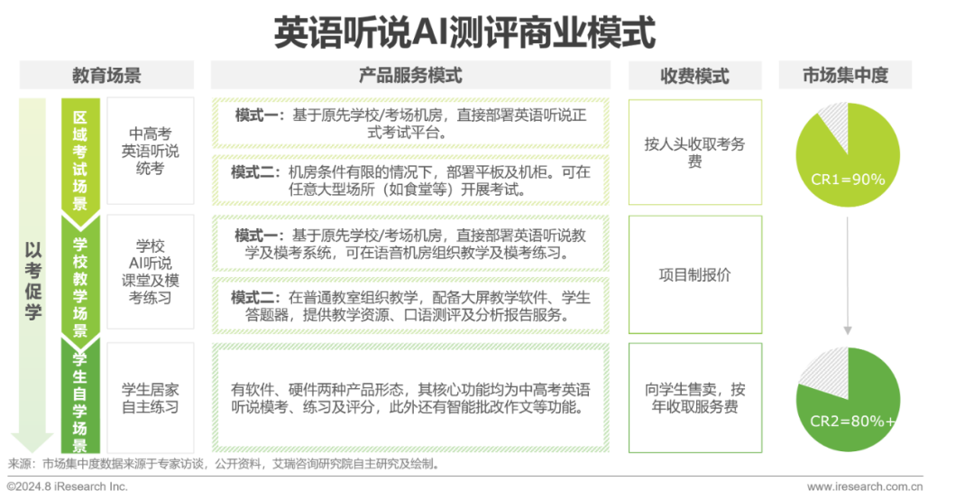 听说考试AI测评的市场远没有达到饱和的状态,未来市场仍有一定的发展空间,但新高考改革已进行多年,目前市场的增速已有所放缓。当前市场集中度较高,在正考场景下CR1达到90%的水平。由于学校模考、教学非常看重“中高考同源测评技术”,率先占领区域考试场景的厂商更易在校内教学场景中占据一席之地,并以此为基础影响学生购买练习产品。由听说考试需求延申出的自主练习场景,应用的采购者也因此从区域或学校端转变为学生端,形成了服务C端学生的市场。因此在C端服务中,CR2也已达到80%的水平。当前市场中,讯飞、听说科技已在这一领域深耕多年,佳发教育随后入局,此外希望进入市场的厂商类型丰富,C端也已有更多软硬件产品开始植入英语听说模考练习功能,在竞争之下,艾瑞预估未来校内、校外两端市场的集中度均将下降。