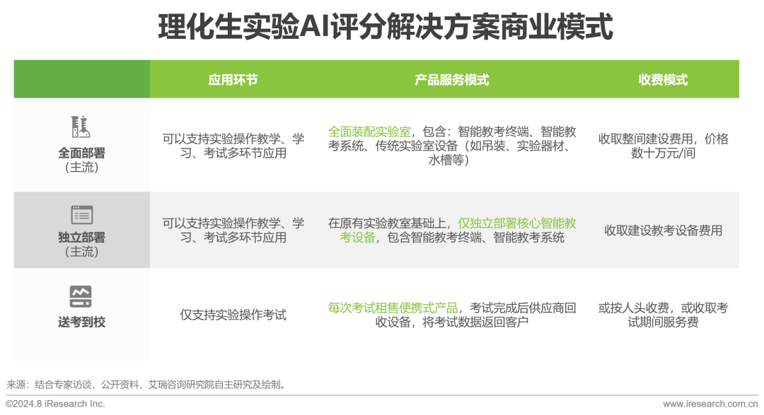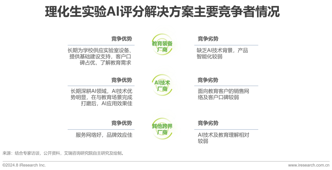 理化生实验设备供应是个发展了几十年的传统行业,但智能测评产品是个刚刚起步的发展新方向。理化生实验考场建设的可规模化、实验环境的标准化、各地实验考纲的相似性,吸引了一批智能测评产品供应商入局。理化生AI测评解决方案的主流竞争者为传统教育装备厂商及AI技术厂商2类玩家。前者的智能教考产品可与实验室设备整合后打包进校,建设整体实验室及标准化考场。其服务优势也十分明显——了解教育客户,客户口碑占优。后者则基于自身的AI技术优势,所研发的产品智能化程度高、效果佳,多在原有实验室基础上独立部署进校,也可与教育装备厂商合作,整合实验器材整体打包进校。由于理化生AI教考设备的模式较重,同时AI技术进入正式考试需要较长的试点、验证的周期,目前AI解决方案多以试点形式落地区域考试或学校教学。