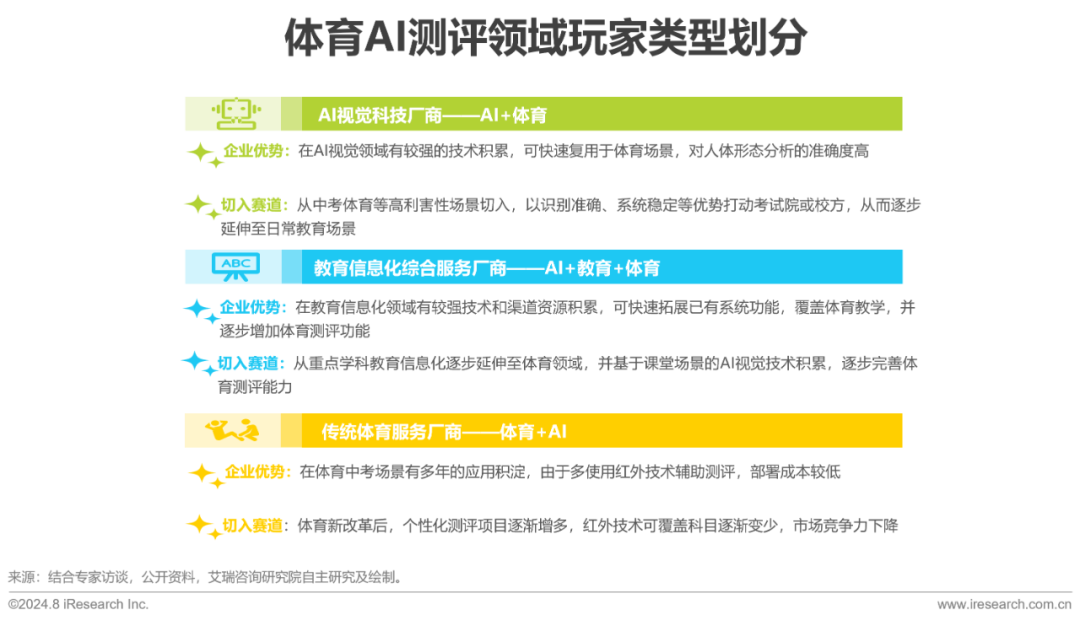 体育AI测评领域目前最主要的解决方案是便携式/一体机式和智慧操场建设2类方案,前者通常资金投入较低,且设备使用灵活,商业模式以租赁和软硬件一体化购买为主;后者通常资金投入较大,但最符合传统体育活动的开展需求,商业模式以软件算法服务采购为主。目前行业内的玩家基于自身基因选择不同切入赛道方式,AI视觉科技厂商通过“AI+体育”的方式,借助技术优势从中考体育尝试延伸至日常教学场景;教育信息化厂商通过“AI+教育+体育”的方式,借助渠道优势从传统教学场景延伸至体育场景;传统体育服务厂商通过“体育+AI”的方式,尝试在传统测评方案中加入AI技术继续保持自身竞争力,但难度较大。