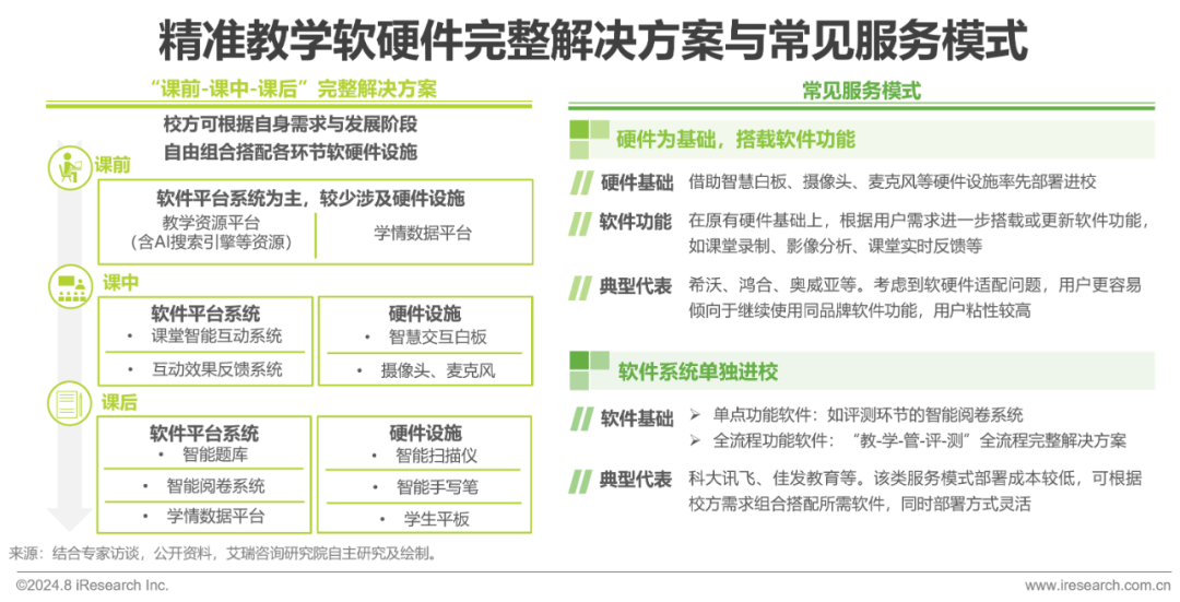 精准教学解决方案并非是行业统一的标准化解决方案,不同厂商、不同客户的解决方案均可能有所差别。从客户角度,校方可基于自身课前、课中、课后的教研教学需求,自由组合不同软硬件方案。课前环节教学资源平台与学情数据平台共同支持教师教研;课中环节教师可借助智慧交互白板等硬件设施的加持,基于课堂智能互动系统等软件系统优化课堂互动;课后环节教师可借助智能扫描仪、智能手写笔等硬件设施的帮助,基于智能题库、智能阅卷系统等高效汇总分析课后作业情况,并进一步完善学情数据平台,实现课前-课中-课后的数据闭环。从厂商角度,当前主要有两类服务模式。第一类是以硬件为基础率先部署进校,后续对搭载或升级软件功能实现增值收费;第二类是以软件为基础进校,根据区域政府/校方需求,提供“教-学-管-评-测”或单环节解决方案,后续派驻技术员提供软件培训、实时响应技术问题等服务。