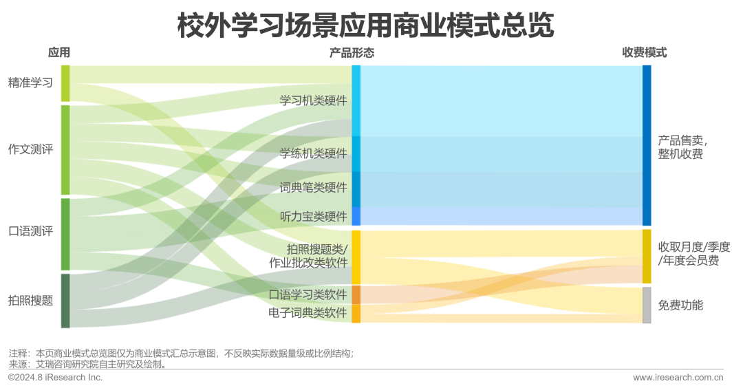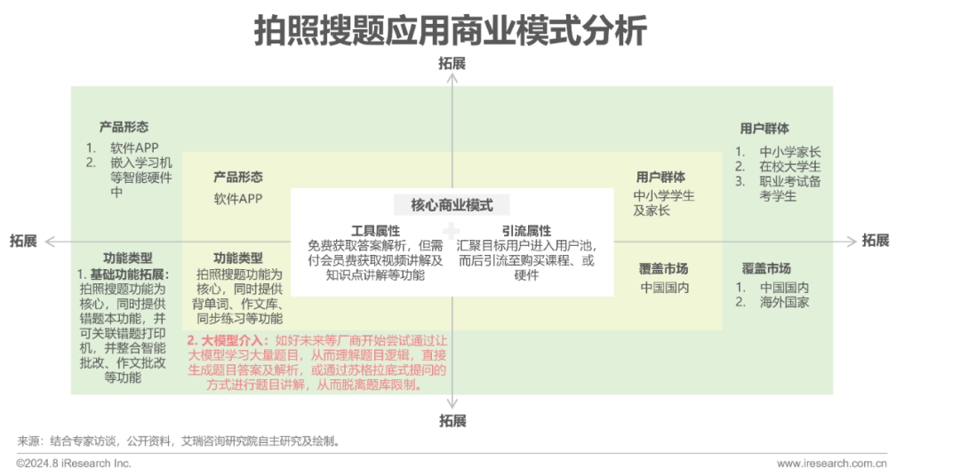 拍照搜题是中国AI+教育市场最早出现的一类应用,最初拍照搜题的核心用户群为中小学学生及其家长,其商业模式包含两类逻辑:其一为工具属性,以收取会员订阅费为主要盈利模式;其二为引流属性,将搜题软件的用户引流至同APP/同品牌课程中,最终收取课程费。而随2021年拍照搜题软件面临的管控与整改要求,其产品定位逐渐转向为辅助家长进行作业检查与辅导。此时,拍照搜题软件的核心商业模式其实并未转变,但为找寻新的盈利出口,厂商开始尝试在现有模式的基础上拓赛道、拓功能、拓市场——用户群拓展至成年人阶段,功能类型拓展了更多批改功能,产品服务模式拓展至嵌入到硬件之中,覆盖市场开始拓展至海外市场。同时,随着大模型的发展,如好未来等厂商开始尝试通过构建AI模型,通过大量学习,理解题目内容从而给出解析,降低成本的同时,脱离原有题库内容的桎梏。