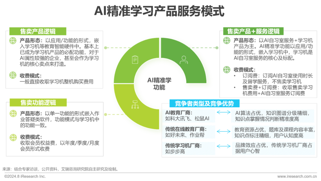 当前AI精准学类应用最为主流的产品服务模式是以软件功能的形式嵌入到学习机中。从学习机的产品服务模式出发还有两类收费模式,其一为单纯售卖整机产品的逻辑,其二为售卖整机+延申服务的逻辑。对于前者而言,AI技术占优的公司会将AI精准学打造为学习机的核心卖点;对于后者而言,学习机与AI自习室服务二者缺一不可,是学习机产品的外延增值服务,同时也有助于拓展学习机的线下销售渠道。这一类应用技术门槛并不算高,当前各类学习机厂商均已打出了AI精准学功能,竞争者类型丰富。