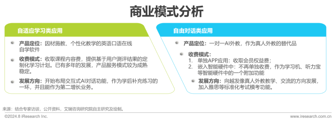传统口语学习APP类产品已在国内发展多年,无论是自适应学习类APP还是英语配音类APP,其产品服务模式均已成熟稳定。但同时,这类产品的用户增长也已步入了平台期。在AIGC技术驱动下,各类传统口语学习软件厂商均开始布局自由对话式AI功能,以寻求更多的发展可能性。由于自由对话类应用模式较轻,技术难度不高,对教育内容积累要求不高,入局门槛低但变现周期短,从AIGC兴起的短短2年时间内,多类型公司挤入此类赛道。但也由于其发展时间较短,目前产品仍有对话模式僵化、识别或反馈内容不精确等问题,若未来希望达到优质真人外教的教学及练习效果,此类产品仍有较长的发展及迭代空间。