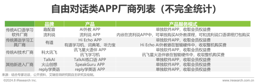 传统口语学习产品服务模式稳定,AI外教类应用快速吸引多类厂商入局