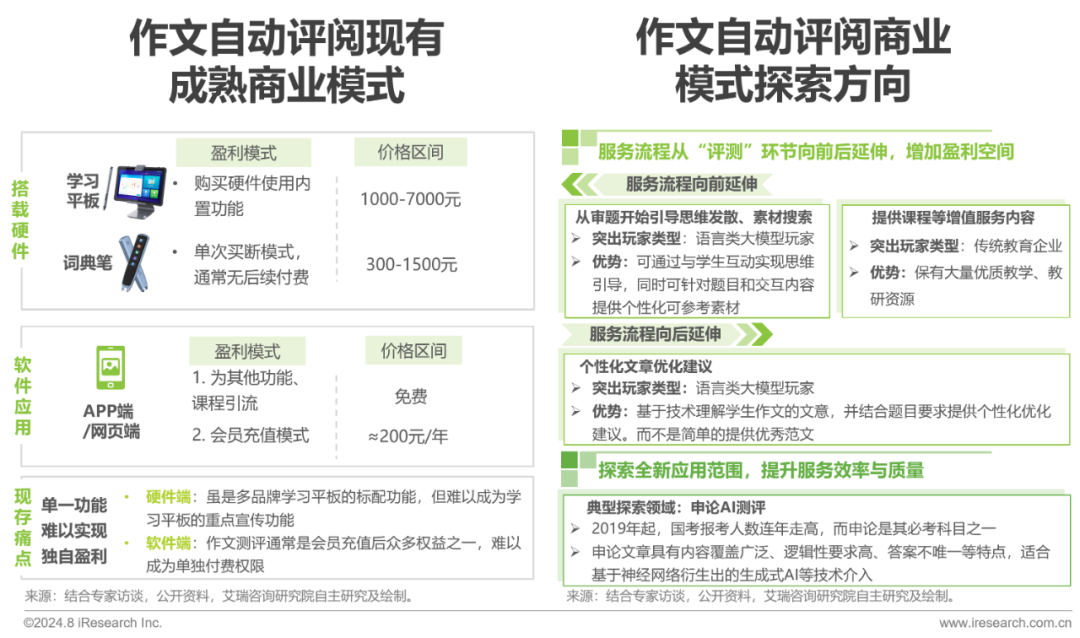 作文自动评阅功能现有商业模式主要取决于产品载体,一方面可选择嵌入进学习平板、词典笔等教育智能硬件中,通过硬件的一次性购买实现盈利;另一方面可选择直接开发为APP端/网页端软件应用,通过免费使用实现为其他功能、课程引流,或通过会员充值模式解锁更多评阅维度。除此之外,不同类型企业也在探索新的商业模式发展方向。服务于传统中英作文评阅的企业尝试通过延伸服务流程增加盈利空间,从仅提供评测功能向前延伸至思维引导、课程提升,向后延伸至个性化文章优化建议。职业教育等领域的企业尝试将作文评阅类功能迁移至全新应用范围,如国考领域的申论AI测评。但整体而言,作文评阅类功能目前属于各企业相关产品的标配功能,短期内依旧难以实现单一功能的独自盈利。