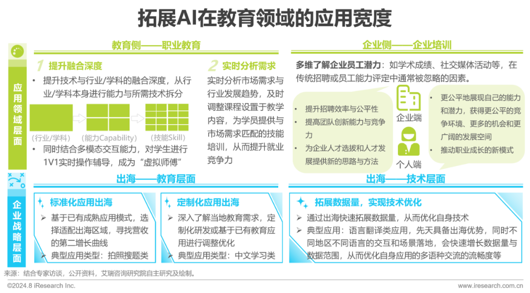 在应用的广度上, AI+教育还应继续探索职业教育、企业培训、出海探索等机会点。首先,我国目前在职业教育领域的授课依旧以理论授课为主,缺乏实操训练,未来技术企业与行业或学科深度融合后,有望为每一位学生提供1V1实时虚拟师傅指导操作,并实时分析市场需求,即使调整教学内容。其次,在企业培训领域,人工智能技术可以进一步多维了解并挖掘员工或面试者的潜力,提高企业竞争力的同时,为员工提供更公平的竞争环境与更广阔的发展空间。最后在企业战略层面,企业可以从教育或技术两个层面寻找出海机会点,教育层面上企业可以尝试通过拍照搜题等标准化应用出海率先打出知名度,或基于当地教育需求进行定制化研发;技术层面上,以语言翻译为代表的技术企业可以尝试通过出海快速拓展数据量与应用场景范围,能力提升与出海增长一举两得。
