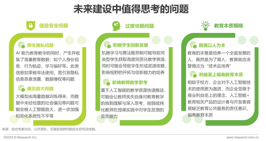 在关注与挖掘人工智能技术在教育领域发展前景的同时,我们还需要关注以下三大问题。首先信息安全问题,人工智能助力教育的一大基础便是收集海量师生的教育数据,此类信息一旦被非法使用,极易引发隐私恶意泄露等问题,同时该类数据中如果存在未经检查的社会偏见等问题,可能会被人工智能系统进一步放大从而加强系统性不平等。其次要谨防师生对人工智能的过度依赖,教学资源的快速“精准”推送,可能导致学生与教师形成资源依赖,限制学生创新能力的培养与教师对教育独到见解的思考。最后还需要时刻谨记人工智能技术的介入不应该模糊教育的本质,一方面应坚守以人为本的基础,另一方面还应警惕企业对商业利益的过分追逐。