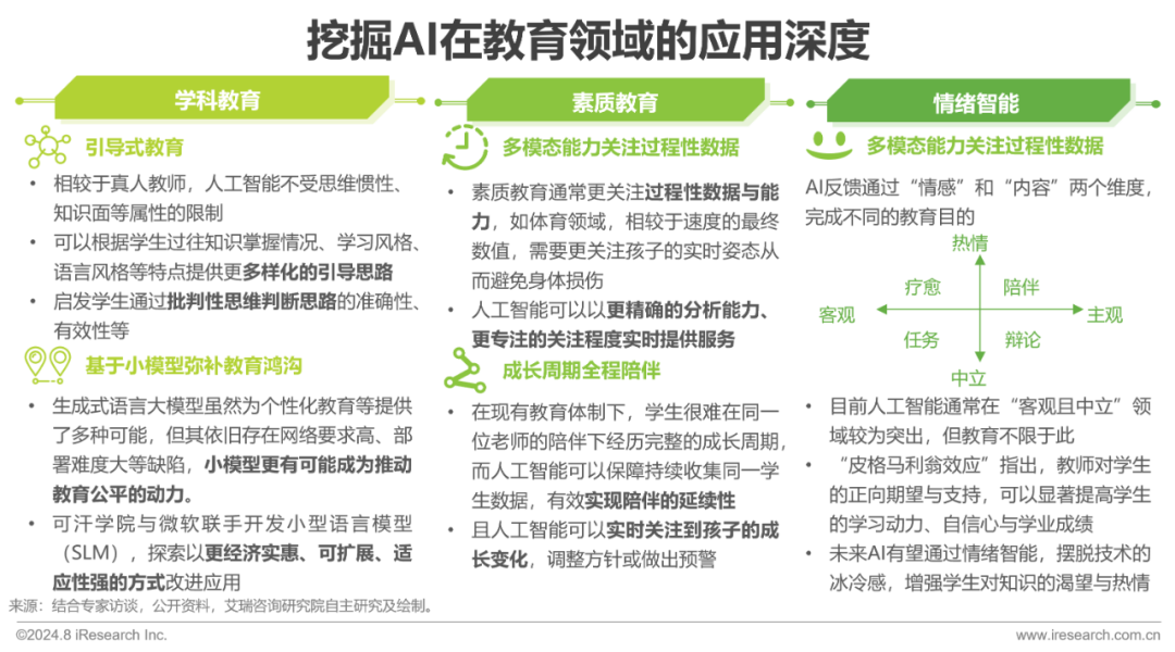教育领域除了需要关注知识学习本身,还需要进一步关注到思维培养、个性发展、心理健康等多维度,因此未来AI+教育有待继续挖掘在素质教育等方面的应用深度,增加教育灵活性的同时,进一步摆脱技术带来的冰冷感。首先在学科教育领域,人工智能不受思维惯性等限制,可以为学生提供更多元化的引导思路,但同时也应尝试通过小型语言模型等方式保障教育的公平性。其次在素质教育领域,人工智能一方面可以通过关注过程性数据拓展了AI技术在素质教育领域的应用想象空间,另一方面通过持续不断收集成长数据实现陪伴与监督的延续性。最后在情绪智能领域,人工智能还需要继续提升情绪理解能力,带来更多疗愈、陪伴等功能,真正做到多维一体的陪伴孩子成长。