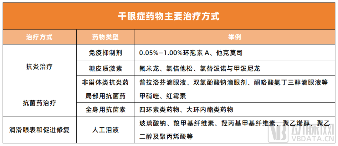 随着入局者越来越多,干眼症的药物治疗更加完善,现已有抗炎治疗(糖皮质激素、非甾体类抗炎药、免疫抑制剂)、抗菌药物治疗、润滑眼表和促进眼表修复治疗(人工泪液)等多种疗法。