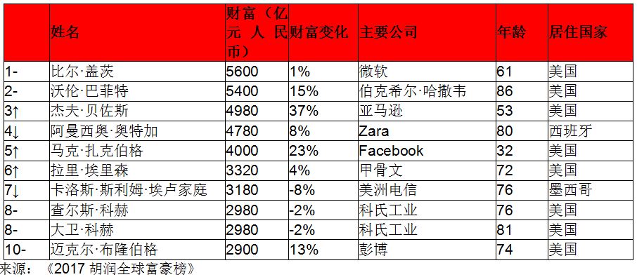不仅面孔熟悉,他们所来自的国家也没有多大变化。排名前十的富豪中,有8人来自美国。杰夫·贝佐斯、马克·扎克伯格、沃伦·巴菲特财富增长明显。贝佐斯财富上涨37%,扎克伯格财富上涨23%,巴菲特财富上涨15%。今年全球十大富豪中没有新人上榜。
