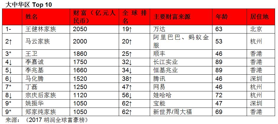 在大中华地区,63岁的王健林及其家族以2050亿财富蝉联2017胡润全球富豪榜大中华地区首富,全球排名第19位,比去年上升2位。截至去年年底,万达集团总资产已经达到7961亿元,营业收入2550亿元。马云及其家族财富2000亿元位列大中华区第二,全球第20位,比去年上升16位。