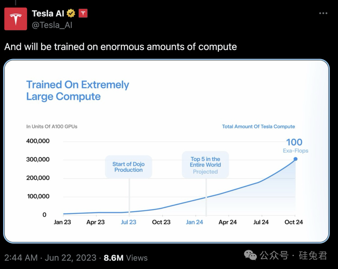 该公司还预测,到2024年2月左右,特斯拉的计算能力将跻身全球前五。到2024年10月,特斯拉的计算能力将支持100百亿亿次浮点运算。