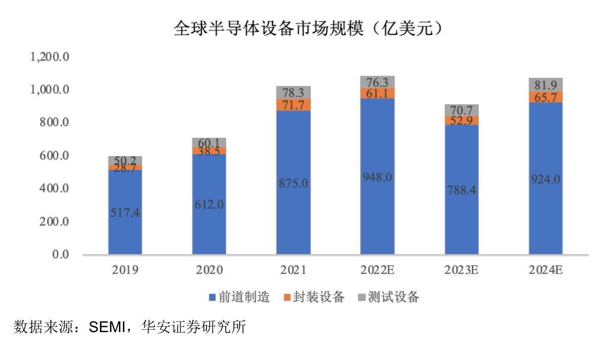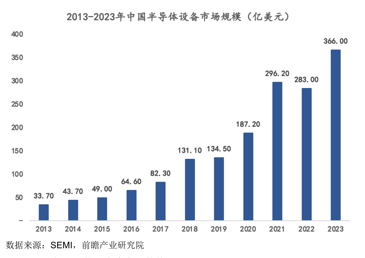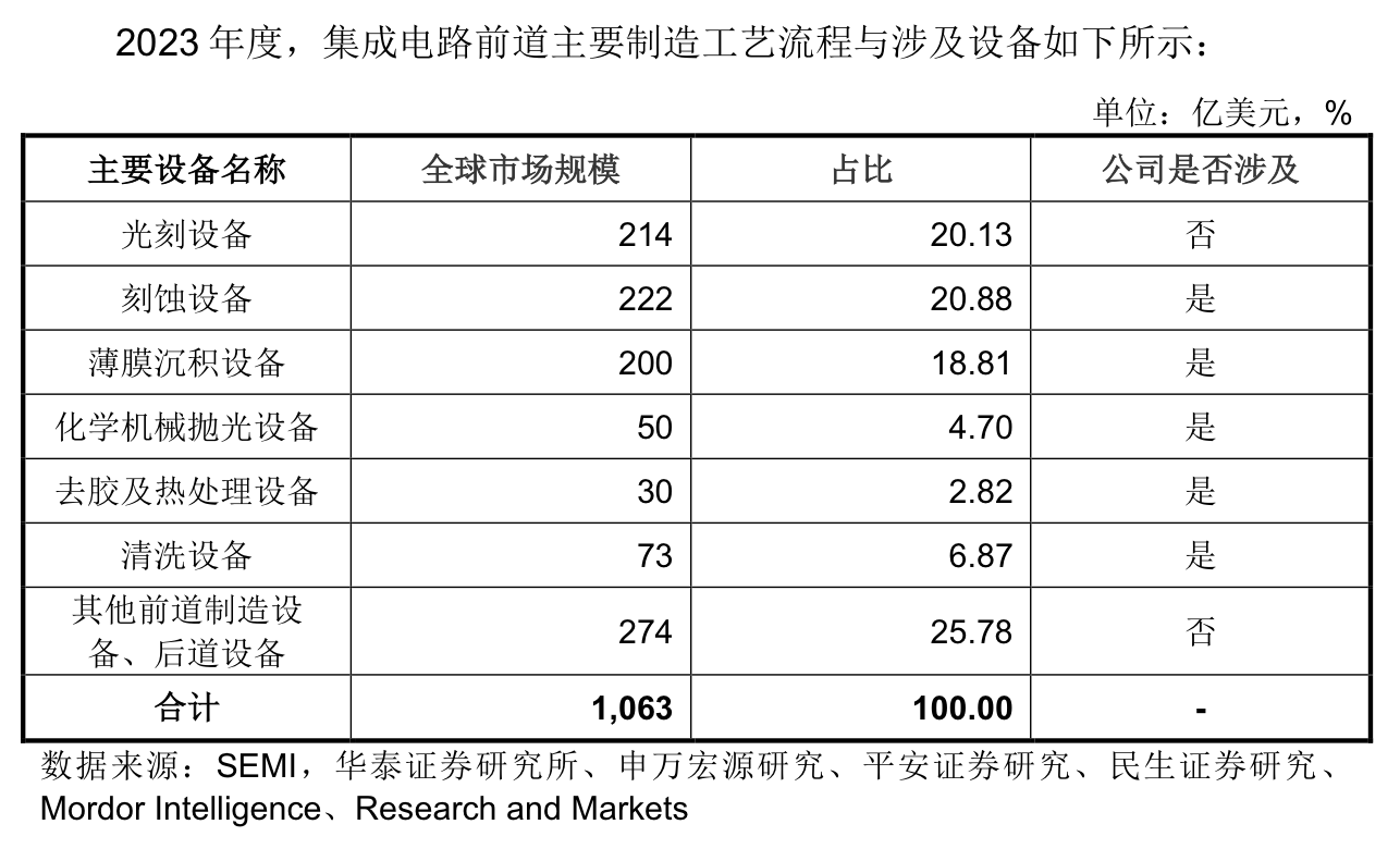 据悉,半导体设备在产业链中的应用领域主要可分为两大类:前道晶圆制造和后道封装测试。根据SEMI发布的数据,全球半导体设备市场规模到2024年将增长至1071.6亿美元。其中前道晶圆制造流程,是芯片制造中最为核心的环节,前道设备占据了整个市场的80%-85%。而前道设备涉及的主要设备中,刻蚀技术和薄膜沉积技术与光刻技术并称三大主要生产技术。先锋精科产品涉及其二。