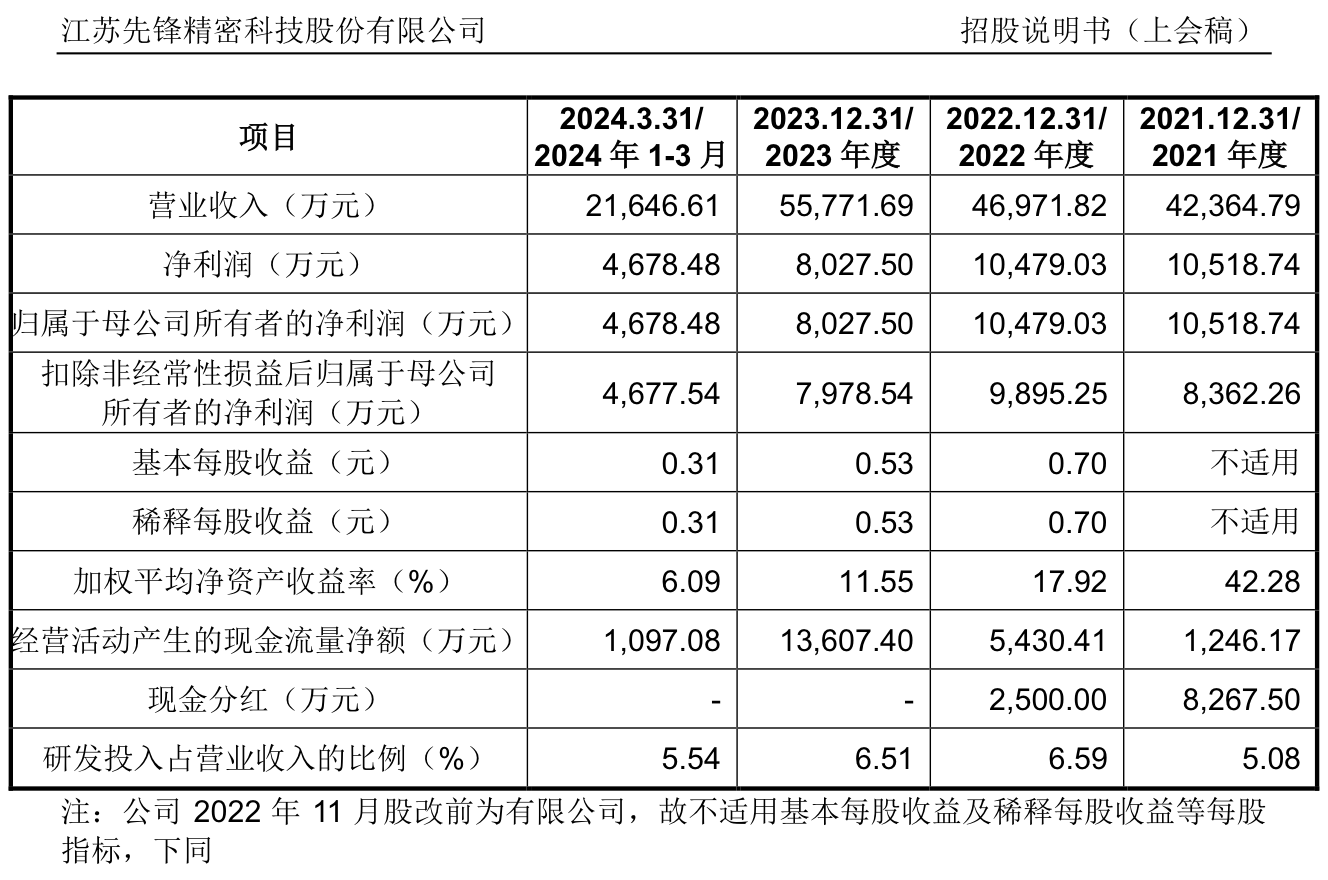 根据说明书,先锋精科2021年至2024年一季度的营业收入分别为4.24亿元、4.7亿元、5.58亿元、2.16亿元;净利润分别为1.05亿元、1.05亿元、8027.5万元、4678.48万元;扣非净利润分别为8362.26万元、9895.25万元、7978.54万元、4677.54万元。2023年公司研发投入占营业收入比例为6.51%。公司在2021年和2022年分别进行了8267.5万元、2500万元的现金分红。