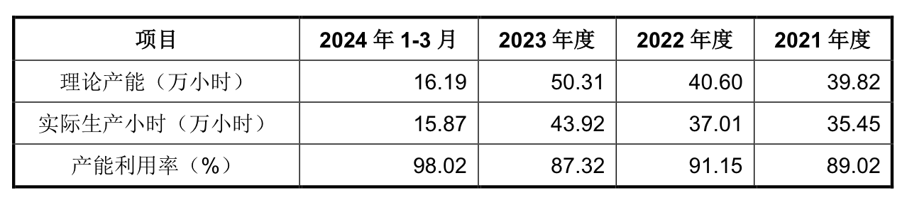 数据显示,2023年先锋精科理论产能50.31万小时,实际生产小时32.92万小时,产能利用率87.32%;2024年一季度的产能利用率为98.02%。
