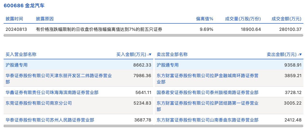 8月13日,金龙汽车今日涨停,龙虎榜数据显示,上榜营业部席位全天成交5.36亿元,占当日总成交金额比例为19.13%。其中,买入金额为3.12亿元,卖出金额为2.24亿元,合计净买入8848.47万元。
