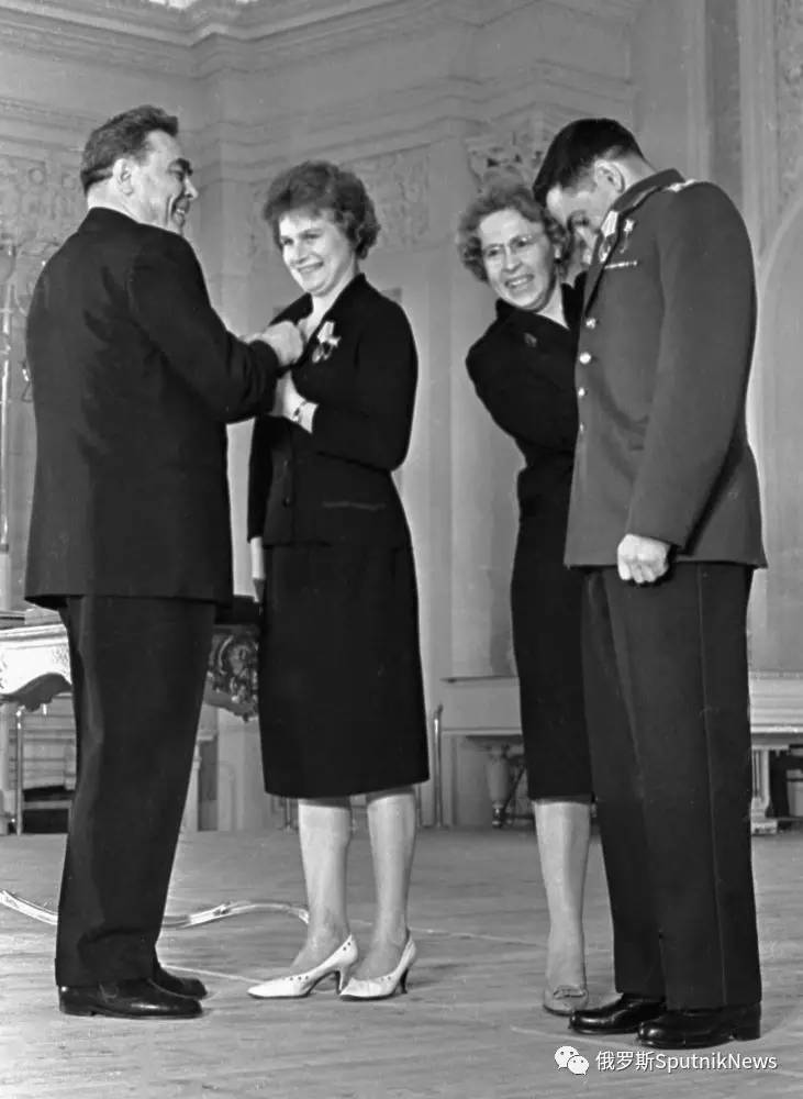 苏联最高苏维埃主席团主席列昂尼德·勃列日涅夫向宇航员瓦莲金娜·捷列什科娃与瓦列里·贝科夫斯基授予政府奖