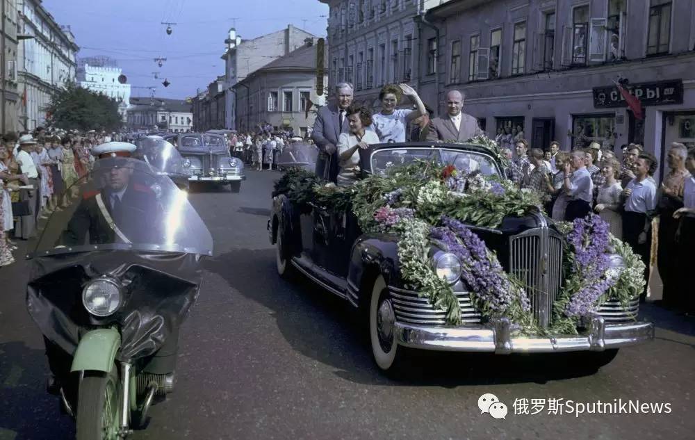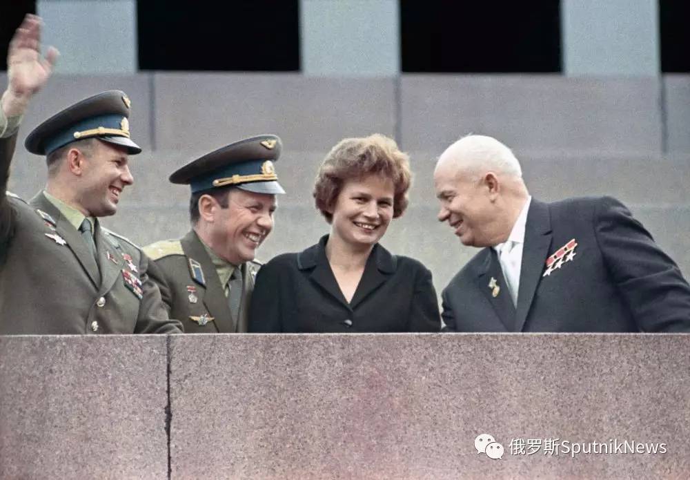 宇航员尤里·加加林、巴维尔·波波维奇、瓦莲金娜·捷列什科娃与苏共中央第一书记赫鲁晓夫在红场