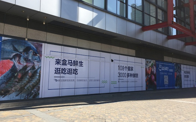 3月7日,界面新闻记者走访盒马首店时发现,盒马鲜生线上业务于3月7日正式运营,盒马鲜生所在的新城市广场购物中心外立面打着巨幅盒马广告,并引导消费者下载App注册成为会员。盒马所在的地下一层目前仍在装修无法进入,入口装修的围挡也未撤掉,但盒马鲜生的配送员已经开始进进出出进行线上订单的配送了。