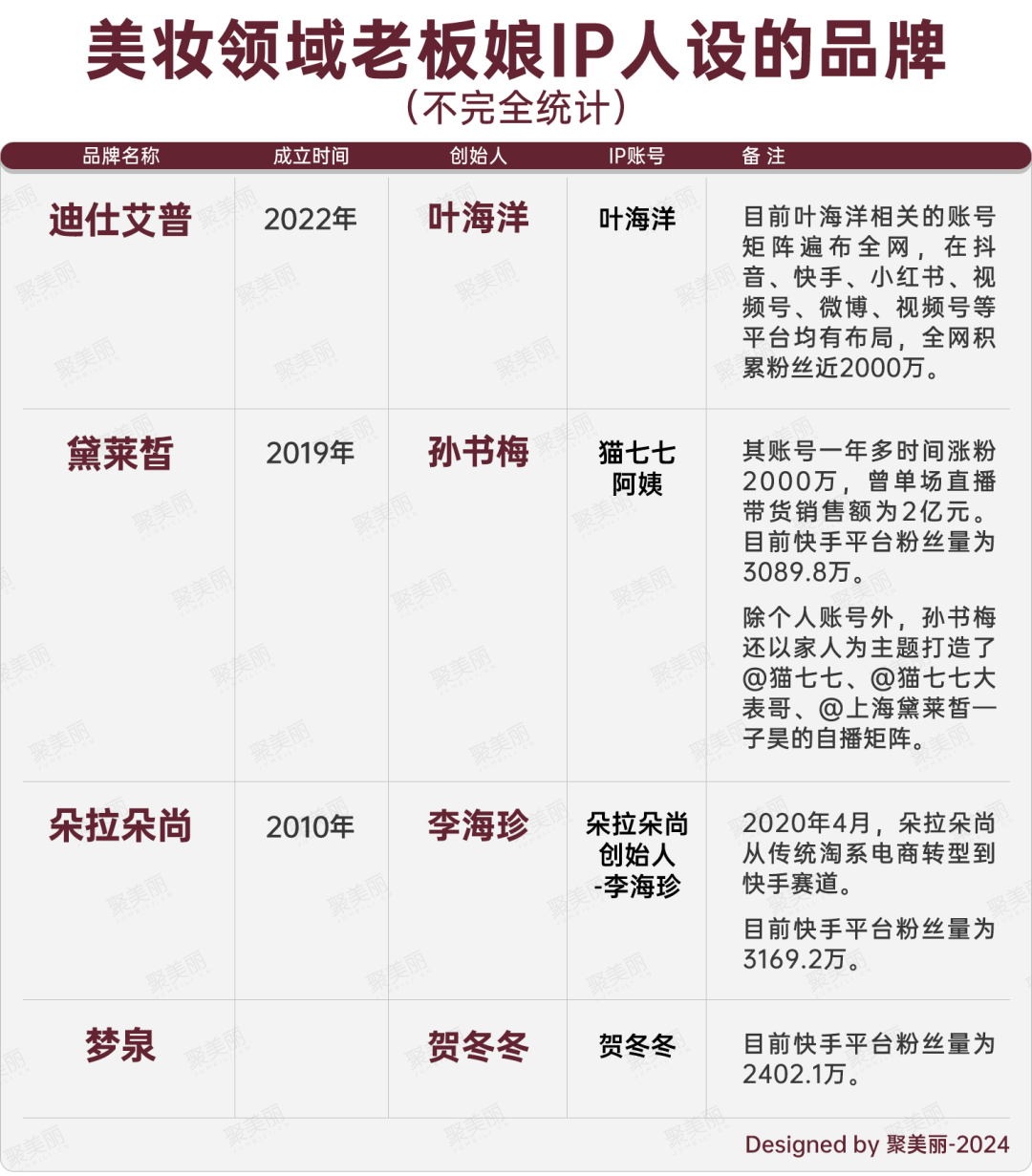 值得注意的是,除了叶海洋的迪仕艾普,上图中其他的均是从快手平台起盘的美妆品牌,而这些快手原生品牌便是通过创始人个人IP培养和积累粉丝,同时结合头部主播的矩阵账号强化品牌的知名度。