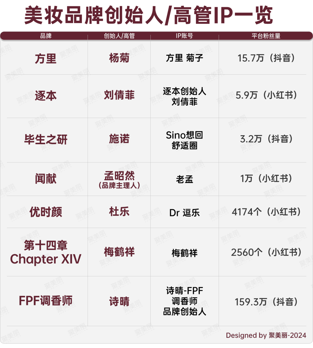 譬如,毛戈平、张大奕、张沫凡等创立的品牌就吃到了红人IP的红利。再如,借助“大女主”形象创立品牌的叶海洋,包括一些在抖音、快手起盘的美妆品牌,打造的老板娘IP人设等等。又如,前文提到的逐本、方里、毕生之研等均在做创始人IP。
