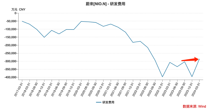 蔚来的研发费用一直非常之高,2023年支出超过130亿元,2024年Q1同环比均有了收缩的势头。销售人员在前方拼命出血,后方科研人员也就能省则省了。