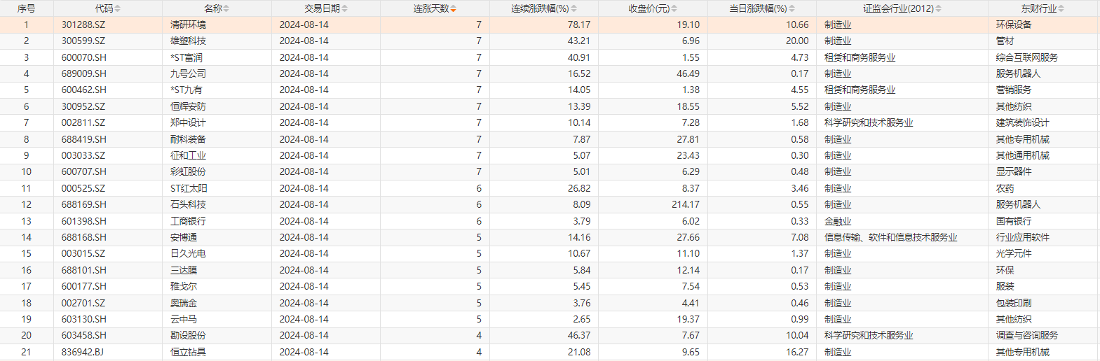 Choice数据统计,今日10只个股连续7天上涨,包括清研环境、雄塑科技等;3只个股连续6天上涨,包括工商银行、石头科技等;此外安博通、雅戈尔等6只个股连续5天上涨;勘设股份、恒立钻具等连续4天上涨。