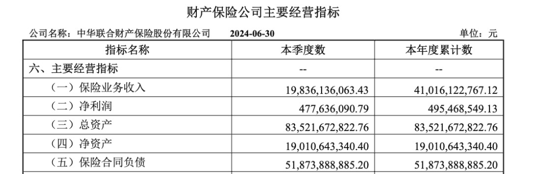 随着2024年第二季度偿付能力报告出炉,中华财险“增收不增利”的局面仍未改变。2024年上半年,中华财险实现保险业务收入410.16亿元,同比增长3.93%;实现净利润4.95亿元,同比下降15.75%。