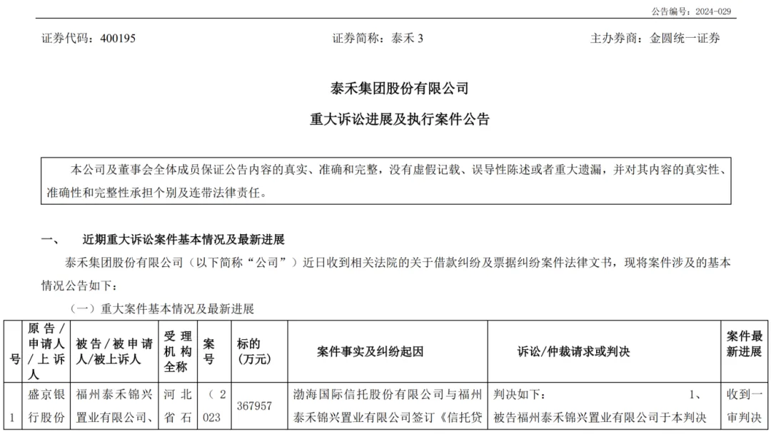 2019年7月,福州泰禾新世界归还3亿元本金,后因未能还本付息被中华财险、中华联合人寿保险股份有限公司、渤海人寿保险股份有限公司诉至法庭。