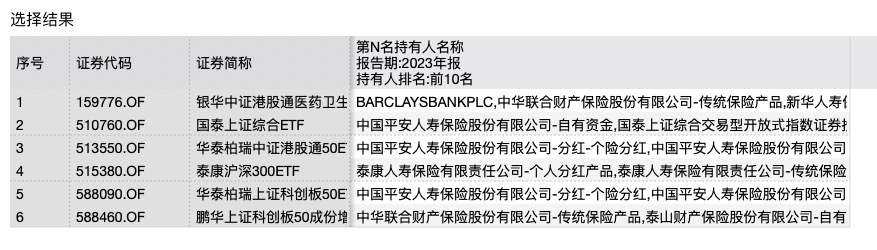 Wind数据显示,截至2023年末,中华财险押注了银华中证港股通医药卫生综合ETF、国泰上证综合ETF、鹏华上证科创板50成份增强策略ETF等7支股票型基金,近一年来均为下跌状态。