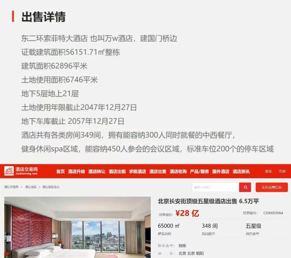 酒店交易网显示,北京长安街顶级五星级酒店出售,作价28亿元。出售详情中指出,该酒店为东二环索菲特大酒店,建国门桥边,证载建筑面积56151.71平方米整栋;酒店共有各类房间349间,拥有能容纳300人同时就餐的中西餐厅等内容。