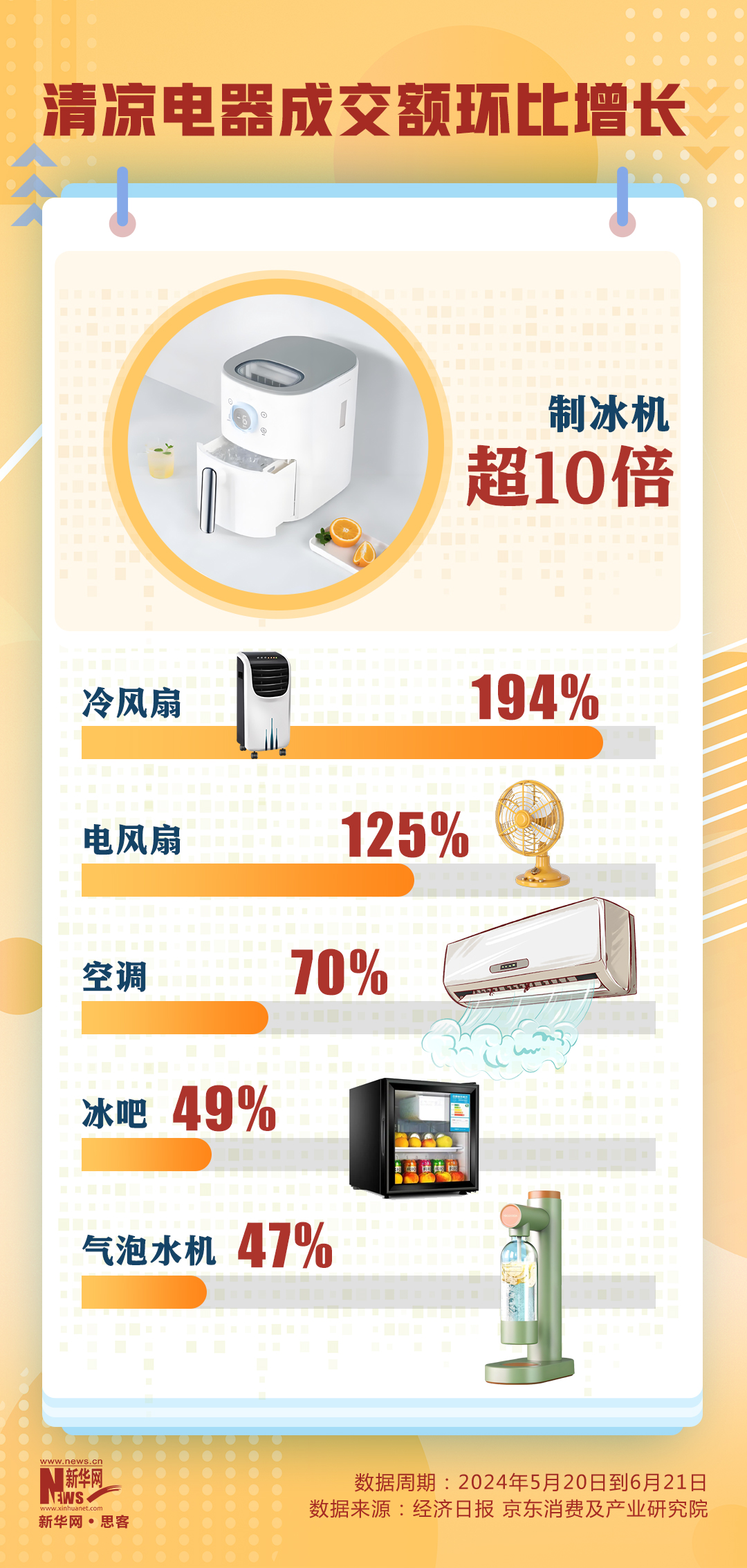 其中,我们发现清凉电器大类下,制冰机遥遥领先,成交额环比增长超10倍;冷风扇增长近2倍,此外冰吧和气泡水机也成为了今夏的新贵。