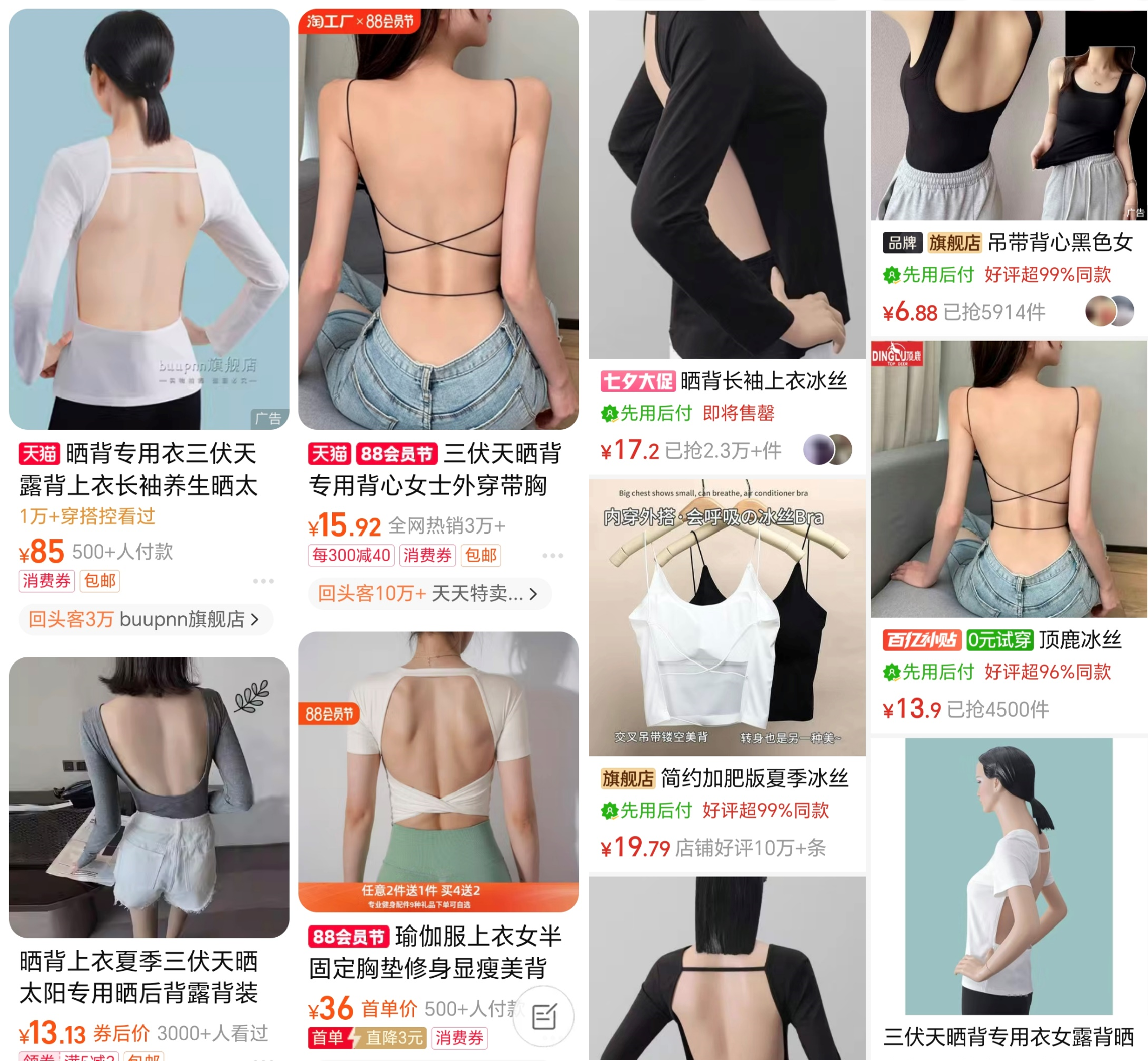 尽管仔细观察会发现很多所谓的晒背衣不过是露背吊带和瑜伽服的改名重生,但加上了晒背的流量密码后,价格和销量都蹭蹭上去了。