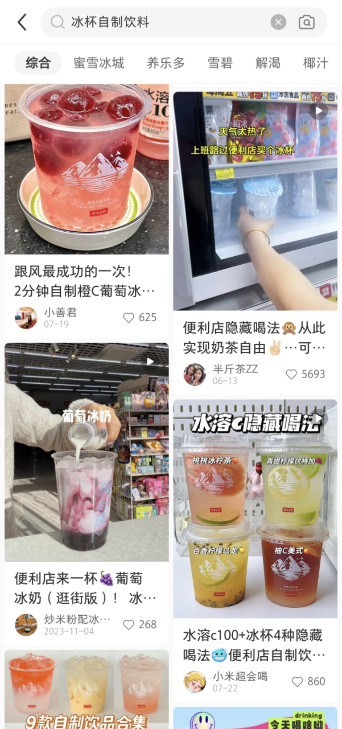 而在社媒端,冰杯的热度也水涨船高,小红书上搜索关键词“冰杯”能找到6万+篇笔记。夏日特调、DIY饮品等各式话题下,相关攻略收获了众多点赞、收藏。以部分博主分享的冰杯DIY省钱攻略关注度最高,比如如何用“一杯冰杯+饮料”自制果茶、咖啡,如何利用冰杯调酒等等。