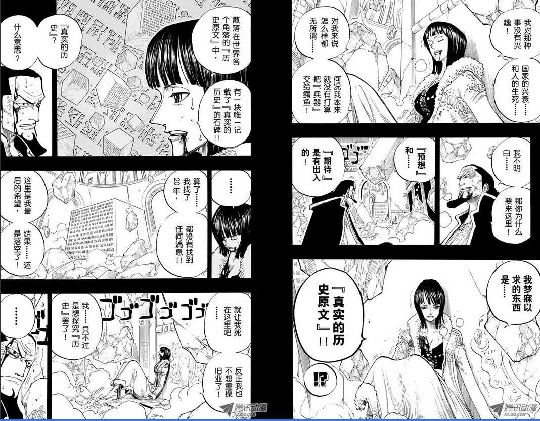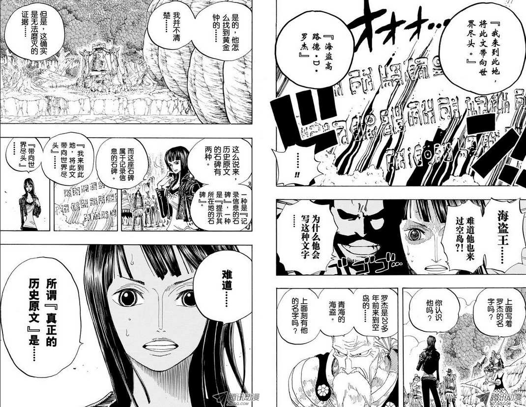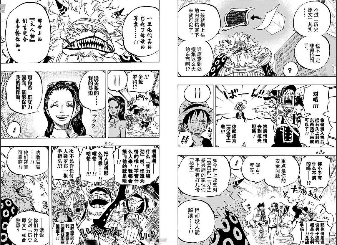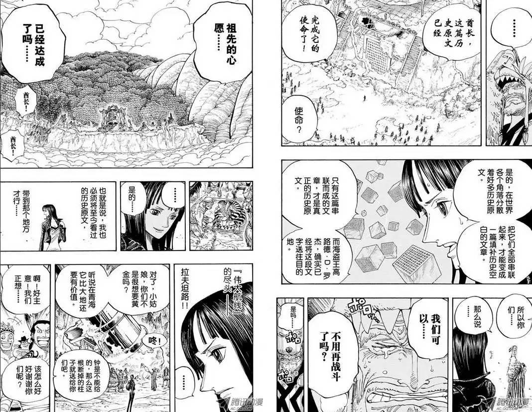 在空岛篇中,罗宾看到了历史文本和海贼王“哥尔·D·罗杰”留下的字迹恍然大悟。原来历史文本分为两种,一种是记录信息,另一种则是提示文本下落。只有将历史文本带到『拉夫德鲁』就能串联起来才能成为真正的历史文本。