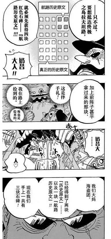 2块历史正文和1块航路历史文本在大妈领地——万国蛋糕城的宝物库。(包含甚平送的那一块,如今三块已经全部被布鲁克成功拓印)