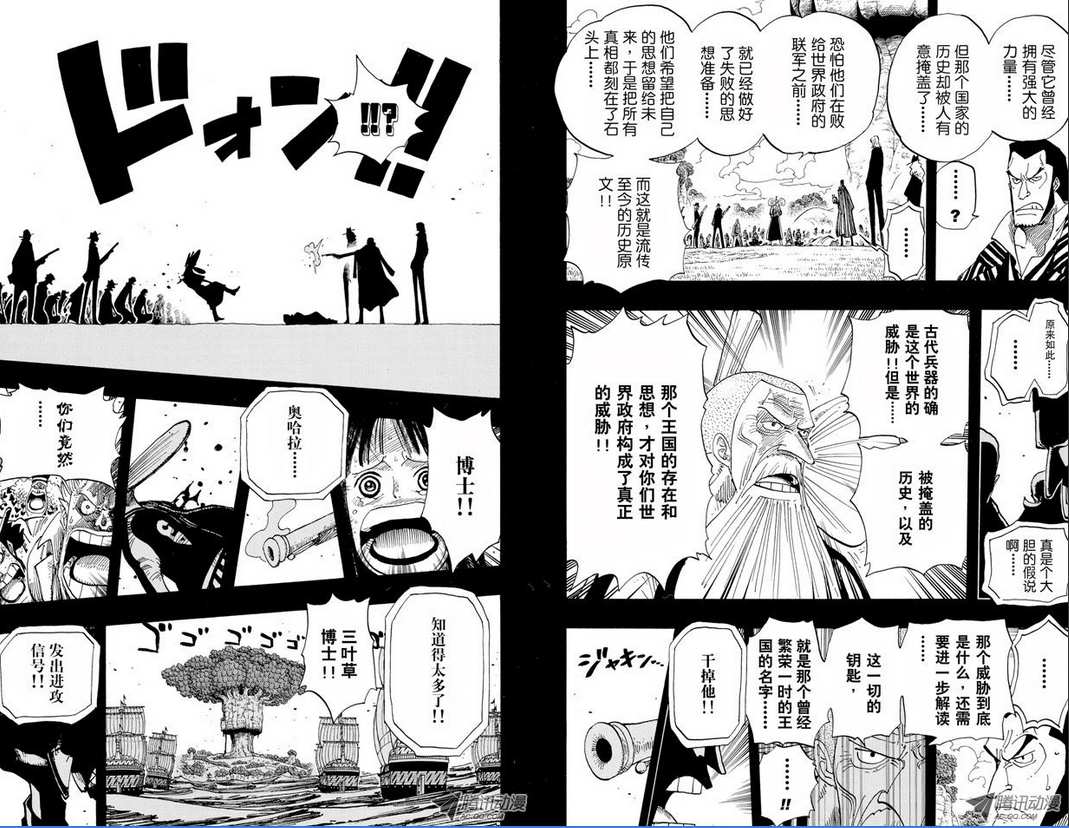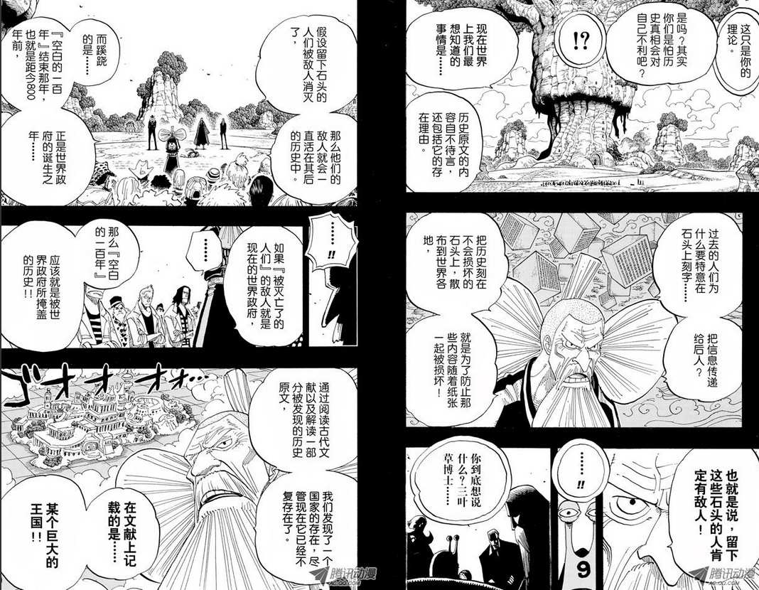 在罗宾的回忆篇中,三叶草博士提出了对空白的100年的假说:从前有个巨大的王国,它被20个国王组成的『世界政府联军』击败。他们希望把思想留给未来,将真相刻在了不会损坏的石头上。政府因为害怕王国的存在和思想对政府构成了威胁而掩盖真相。可惜在即将说出王国的名字时,五老星杀人灭口打断了博士的讲话。