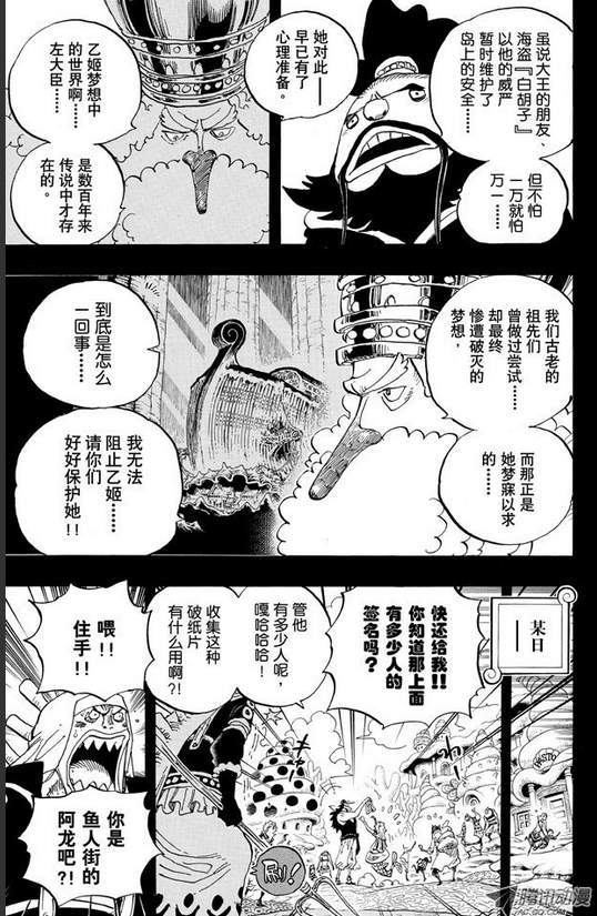 在明哥的口中得到了关于天龙人更详细的情报,800年前组成世界政府的巨大组织的国王们将自己的家族带到『圣地玛丽乔尔』居住。只有阿拉巴斯坦的『娜菲鲁塔利』家族拒绝了,所以应该说是19个家族的后裔。因为王族的离开,这19个国家有选出了新的王族担任国王。