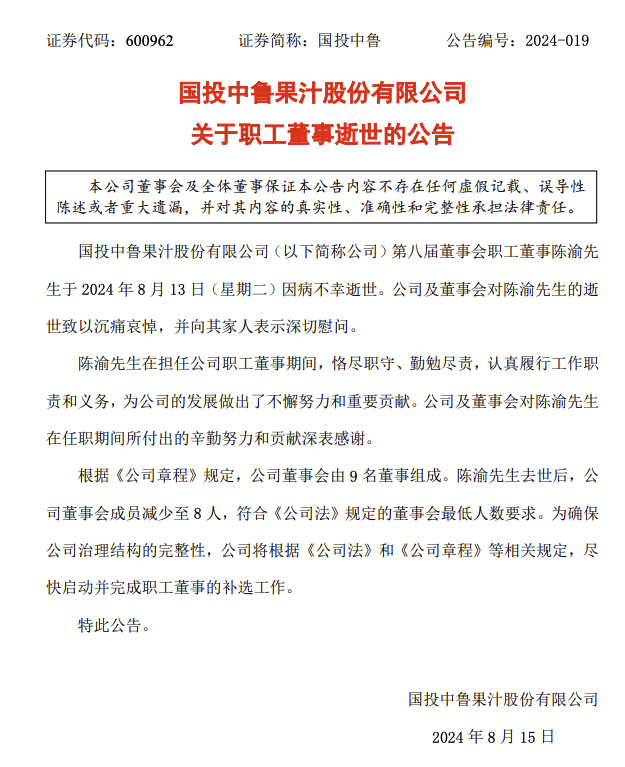 国投中鲁8月14日晚间公告,公司第八届董事会职工董事陈渝于2024年8月13日(星期二)因病不幸逝世。根据《公司章程》规定,公司董事会由9名董事组成。陈渝去世后,公司董事会成员减少至8人,符合《公司法》规定的董事会最低人数要求。为确保公司治理结构的完整性,公司将根据《公司法》和《公司章程》等相关规定,尽快启动并完成职工董事的补选工作。