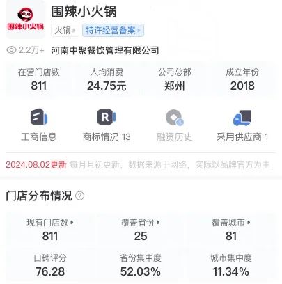 围辣小火锅是小火锅品牌中在近两年扩张最快的,根据窄门餐眼显示,围辣目前已有811家门店,覆盖25个省份。