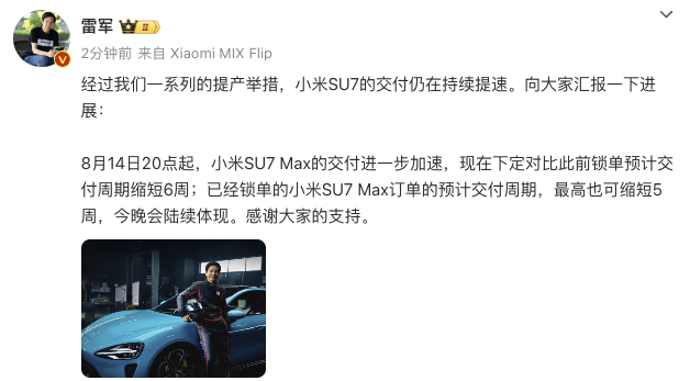 8月14日晚,小米创办人、董事长兼CEO雷军在微博发文透露,经过一系列的提产举措,小米SU7的交付仍在持续提速。8月14日20点起,小米SU7 Max的交付进一步加速,现在下定对比此前锁单预计交付周期缩短6周;已经锁单的小米SU7 Max订单的预计交付周期,最高也可缩短5周,今晚会陆续体现。