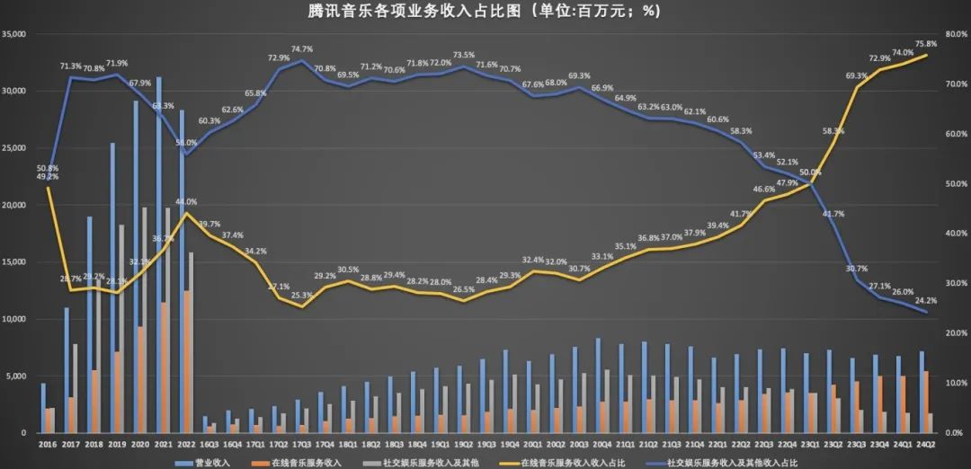 在线音乐服务、社交音乐服务和其他服务是腾讯音乐的两大主营业务,二季度二者收入在总收入中分别占比75.8%和24.2%。