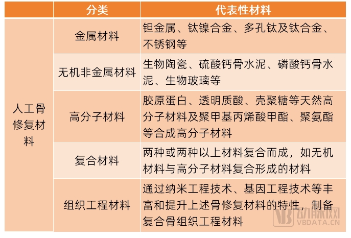 除了同种异体骨为代表的天然骨修复材料,人工骨修复材料也在高速发展。根据材料性质,人工骨修复材料可分为金属材料、无机非金属材料、高分子材料、复合材料、组织工程材料等。